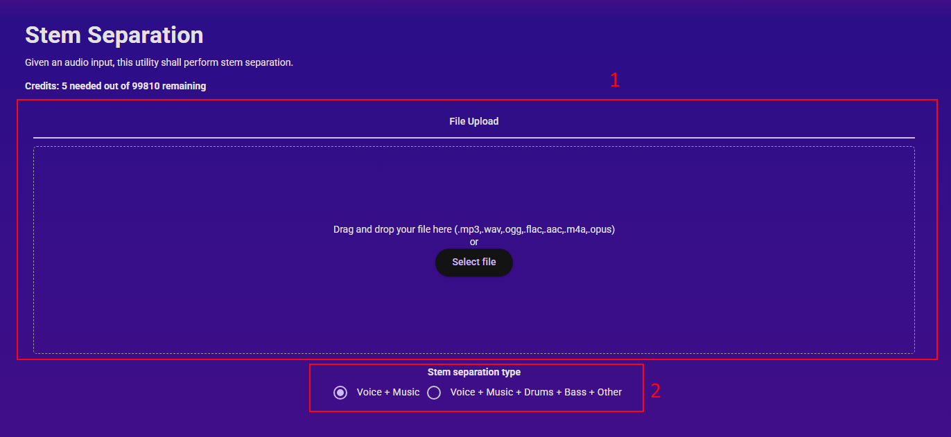 - Select file: click this button to open your system’s file browser and select one file to stem separate or simply drag and drop your file in the dashed area.