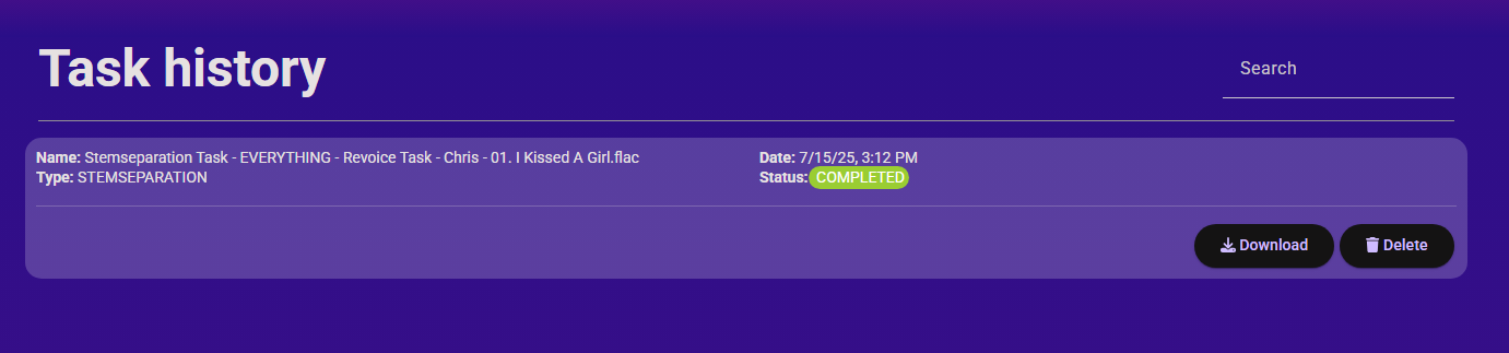 Once processing is done, you can download the individual stems from theĀ My Tasks section that you can reach from the side navigation menu on the left. Here you can find your task, which you can also search by name and download the files or choose to delete them if you want so.