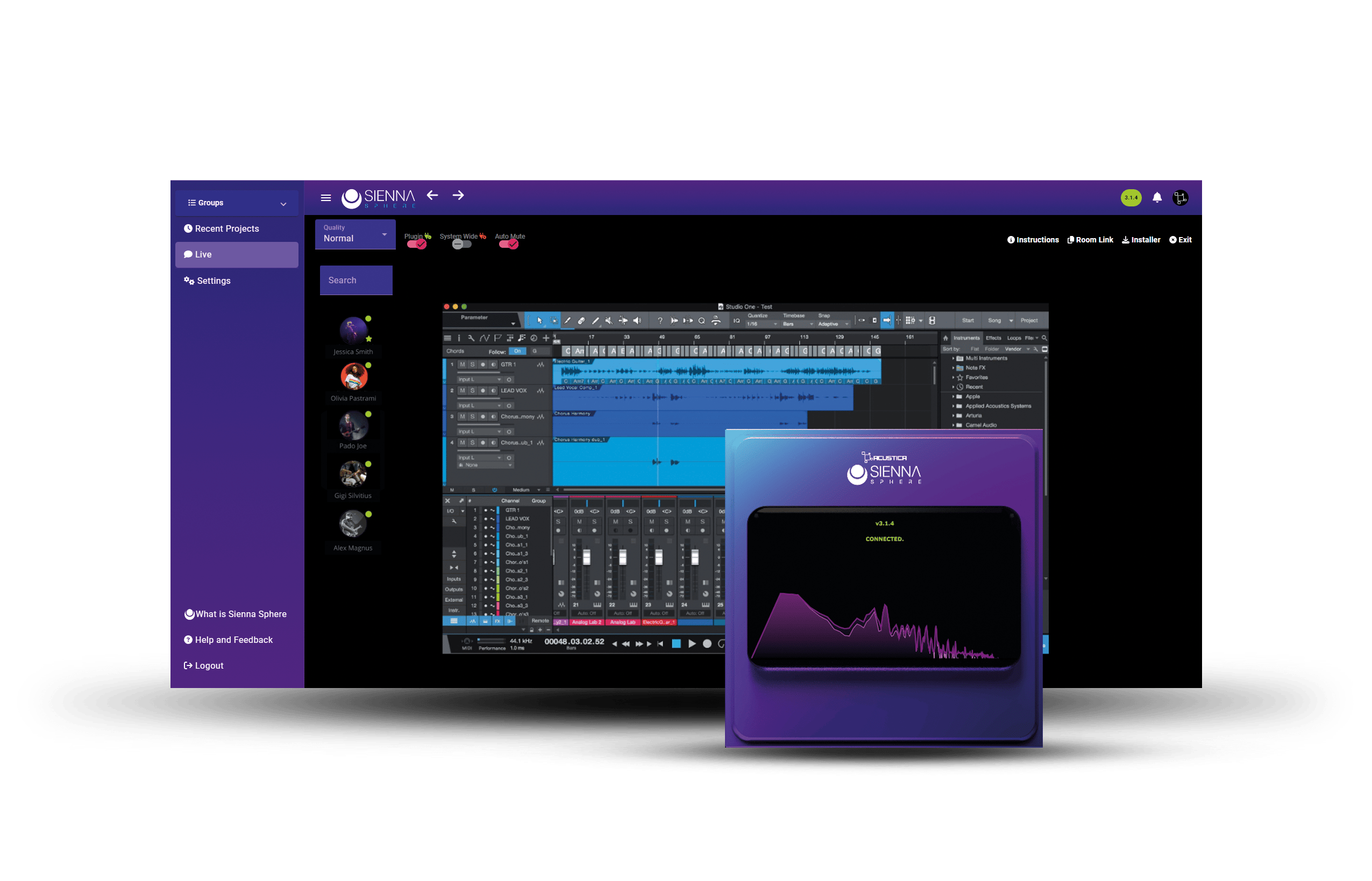 With Sienna Sphere Live, your DAW becomes a true virtual studio: one platform for high-definition audio, video calls, screen sharing, communication, and creative collaboration.