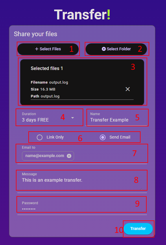 9. Password: here you can set a password for your transfer. Leave blank for no password. You can always change the password after you have sent out your transfer.